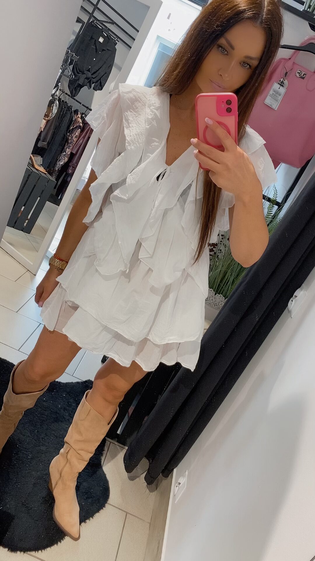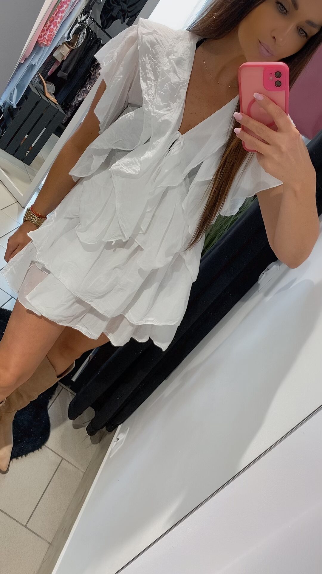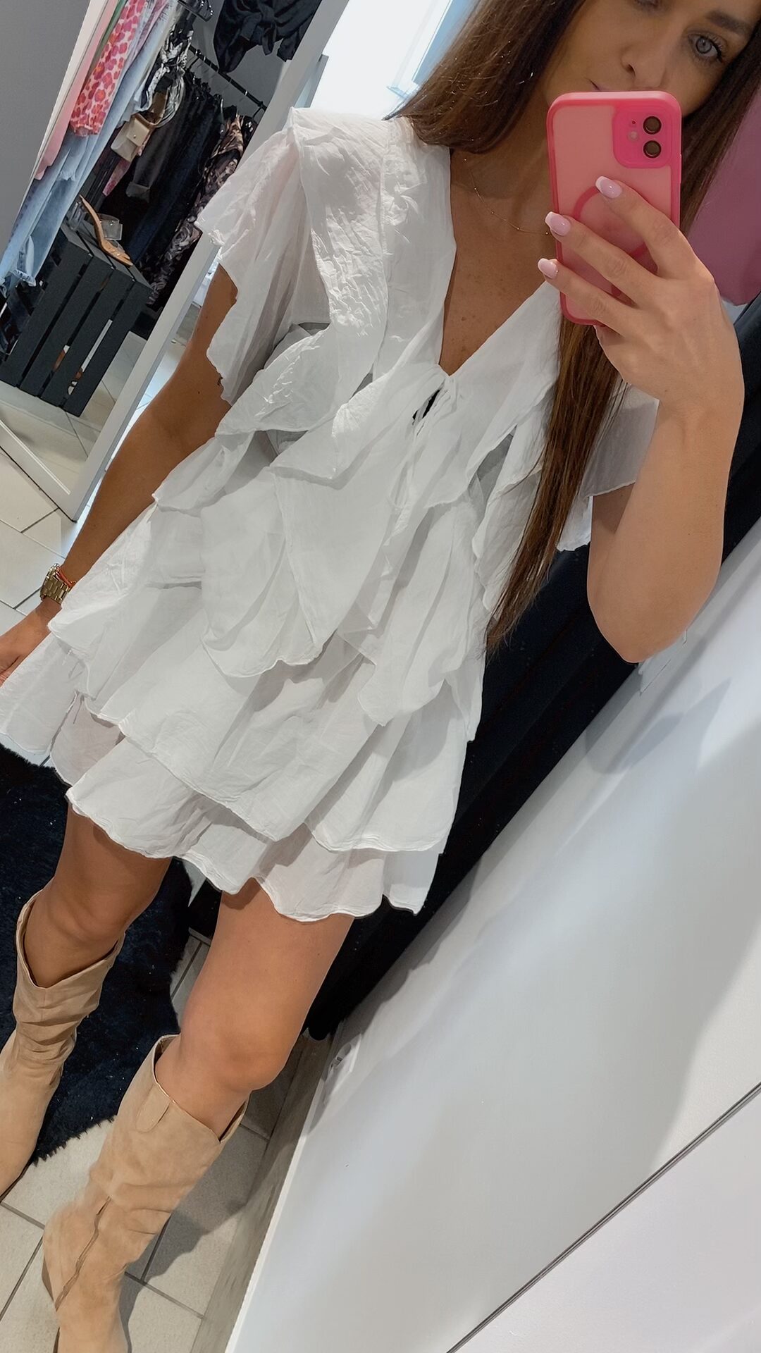 Zjawiskowa sukienka typu mgiełka w klasycznym kolorze bieli, to propozycja dla kobiet ceniących sobie lekkość, kobiecość i wygodę. Uszyta z delikatnego zwiewnego materiału pięknie pracuje w ruchu i podkreśla sylwetkę. Model posiada falbany, które nadają wyjątkowego uroku i subtelnie maskują niedoskonałości figury. Dekolt regulowany troczkiem z wiązaniem. Sukienka nie posiada rozmiaru – pasuje na XS, S, M, L, w zależności od preferencji noszenia – luźniej lub bardziej dopasowana. Dodaj pasek, ulubione klapki lub kozaki – i stylizacja gotowa.